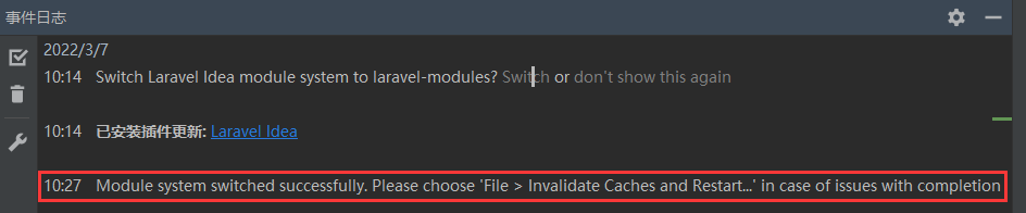3、nWidart/laravel-modules 包,使用 nWidart/laravel-modules 包构建的应用程序的模块系统。最终决定选择此选项。因为现在程序的模块系统依赖于 nWidart/laravel-modules。点击 Switch。模块系统切换成功。 如果出现完成问题,请选择“文件 > 使缓存无效并重新启动…”。如图3