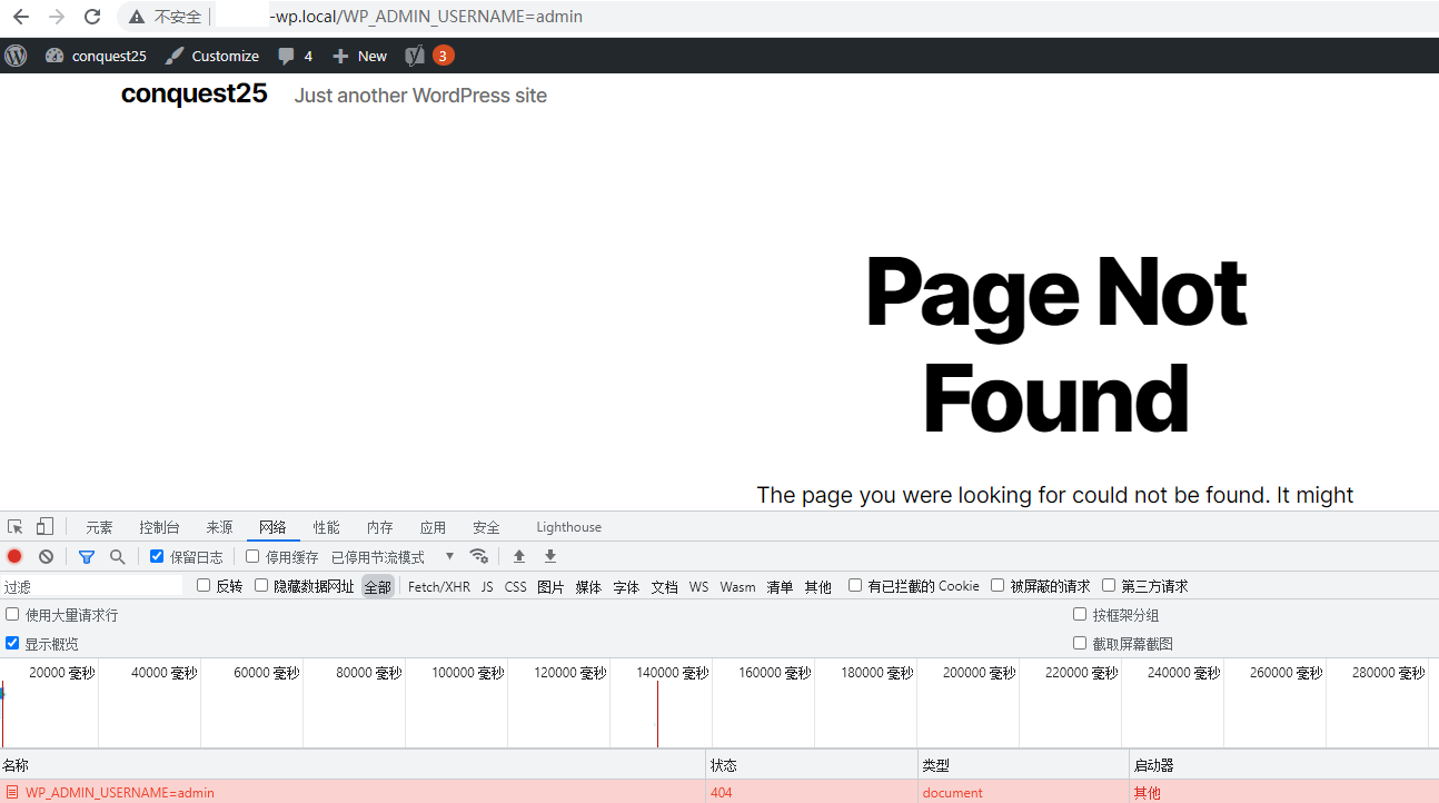 7、在浏览器中打开:http://object-wp.local/WP_ADMIN_USERNAME=admin ,响应 404。但是确定 http://object-wp.local 已经是支持的。如图5