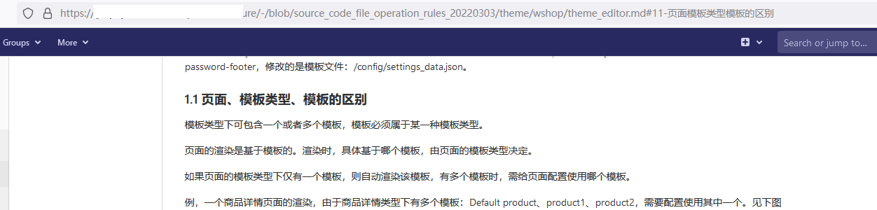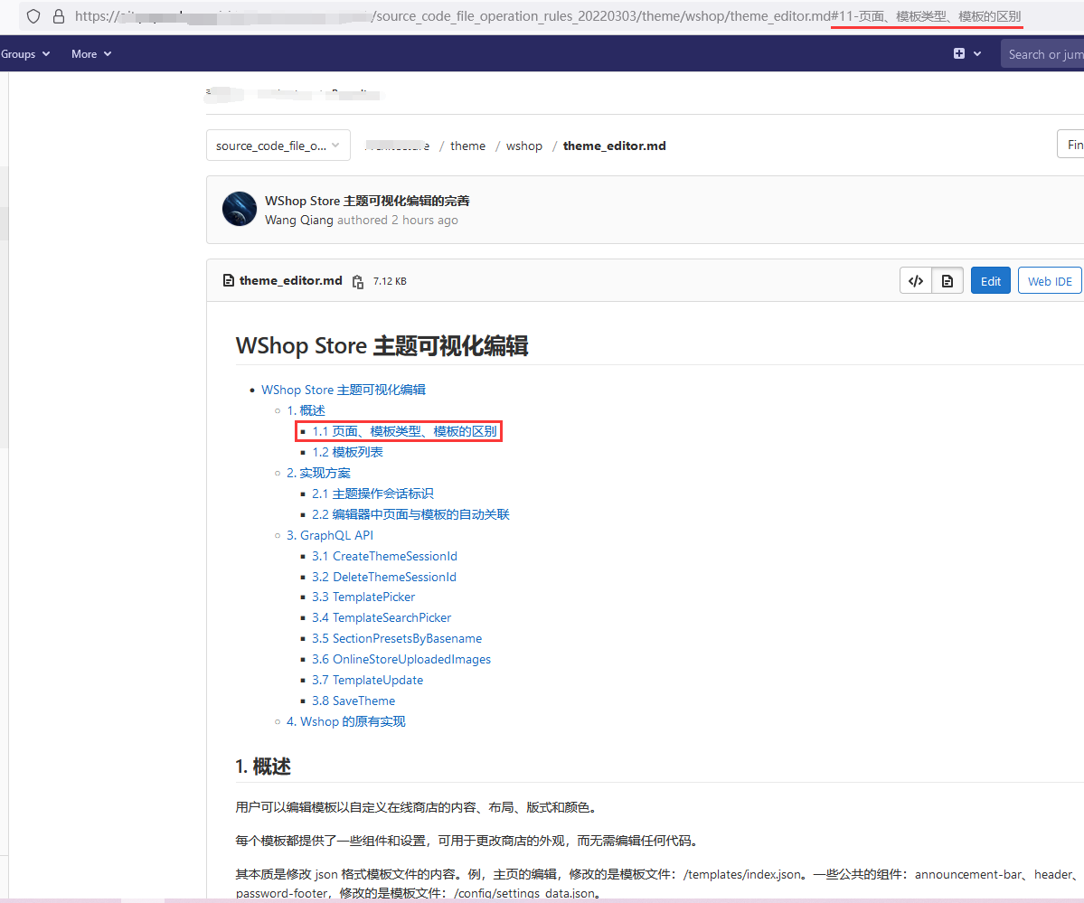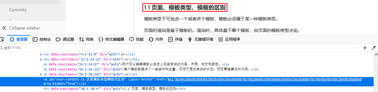 4、编辑现有的 Markdown 文档源码,修改为 #11-页面模板类型模板的区别,相当于去掉了锚点中的标点符号。