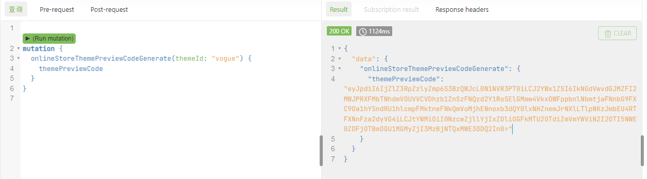 onlineStoreThemePreviewCodeGenerate(themeId: "vogue1") {
