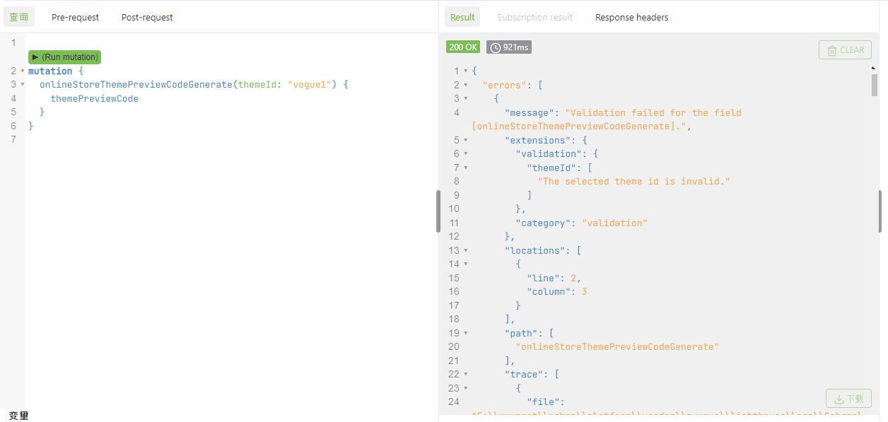 "message": "Validation failed for the field [onlineStoreThemePreviewCodeGenerate].",