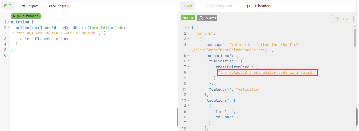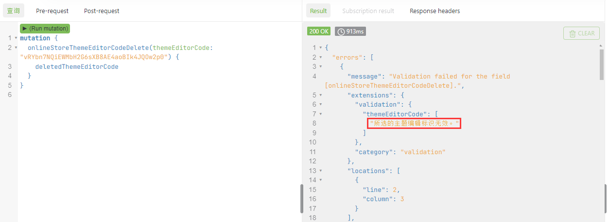 "message": "Validation failed for the field [onlineStoreThemeEditorCodeDelete].",
