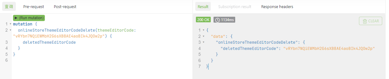 onlineStoreThemeEditorCodeDelete(themeEditorCode: "vRYbn7NQiEWMbH2G6sXB8AE4aoBIk4JQOw2p0") {