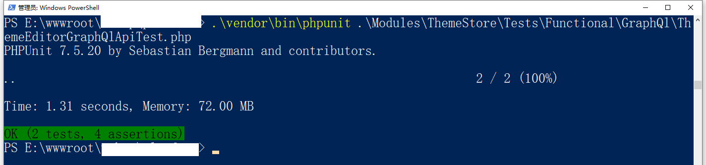 PS E:\wwwroot\object> .\vendor\bin\phpunit .\Modules\ThemeStore\Tests\Functional\GraphQl\ThemeEditorGraphQlApiTest.php PHPUnit 7.5.20 by Sebastian Bergmann and contributors. .. 2 / 2 (100%) Time: 1.31 seconds, Memory: 72.00 MB OK (2 tests, 4 assertions)