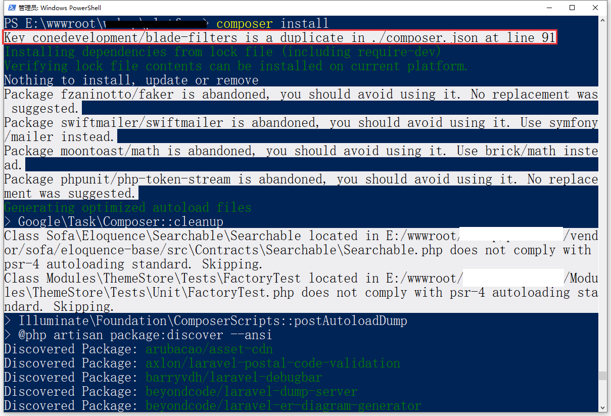 1、执行:composer install 时提示:Key conedevelopment/blade-filters is a duplicate in ./composer.json at line 91。如图1