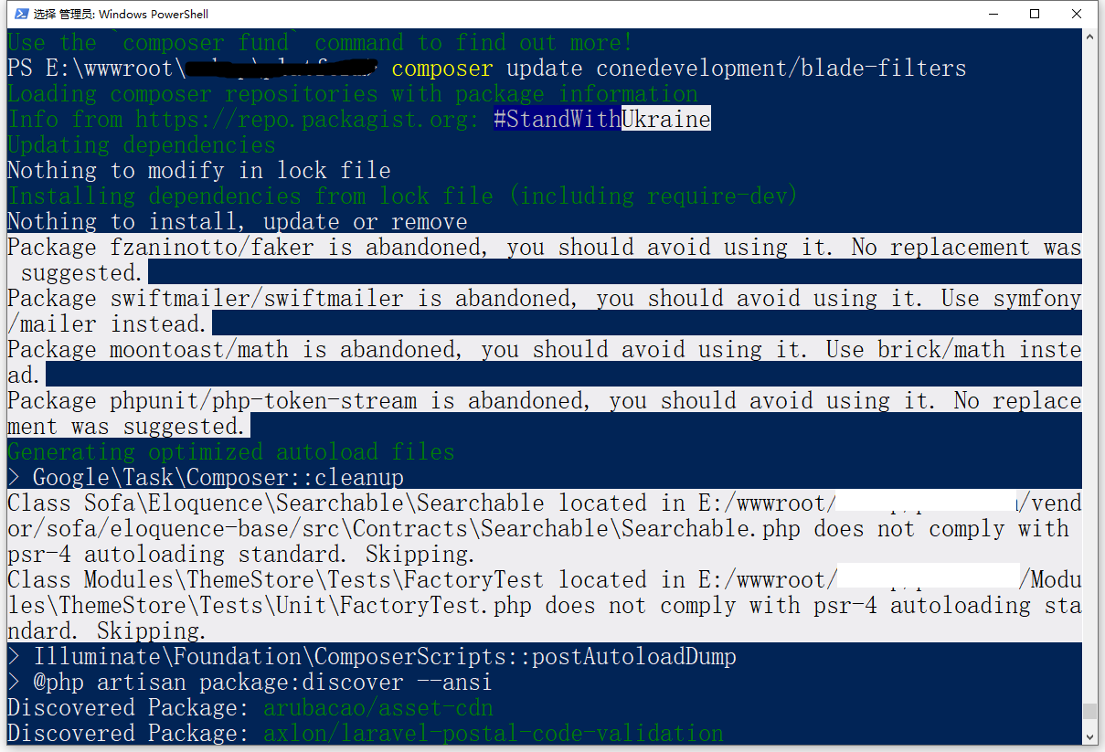 PS E:\wwwroot\object> composer update conedevelopment/blade-filters Loading composer repositories with package information Info from https://repo.packagist.org: #StandWithUkraine Updating dependencies Nothing to modify in lock file Installing dependencies from lock file (including require-dev) Nothing to install, update or remove Package fzaninotto/faker is abandoned, you should avoid using it. No replacement was suggested. Package swiftmailer/swiftmailer is abandoned, you should avoid using it. Use symfony/mailer instead. Package moontoast/math is abandoned, you should avoid using it. Use brick/math instead. Package phpunit/php-token-stream is abandoned, you should avoid using it. No replacement was suggested. Generating optimized autoload files