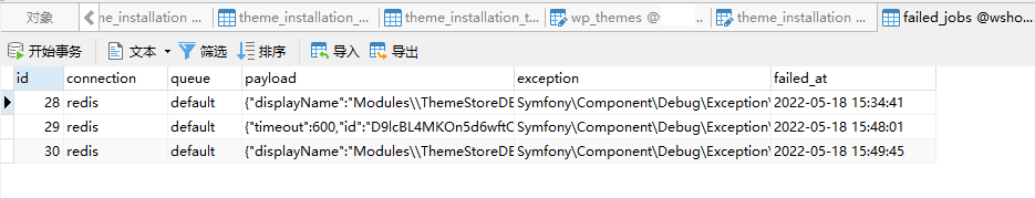 7、当 handle 方法抛出异常时,队列任务执行失败,日志信息插入至表 failed_jobs 中。期望将异常的 message 同步插入至表 theme_installation_task 的字段 message 中。如图4
