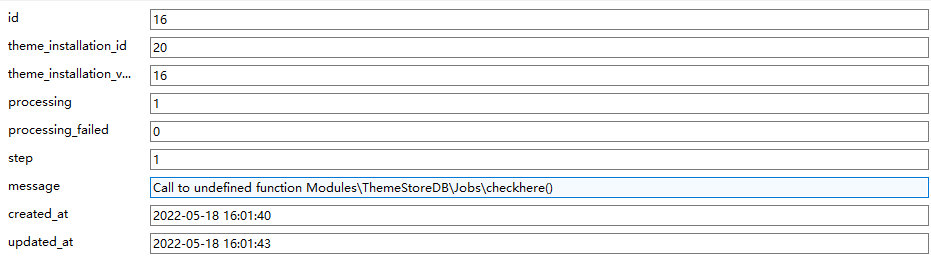 PS E:\wwwroot\object> php artisan queue:listen [2022-05-18 15:49:45][XFUmrUWBn2muST8AXmRXzjVLUr72UUde] Processing: Modules\ThemeStoreDB\Jobs\ThemeInstallation [2022-05-18 15:49:45][XFUmrUWBn2muST8AXmRXzjVLUr72UUde] Failed: Modules\ThemeStoreDB\Jobs\ThemeInstallation