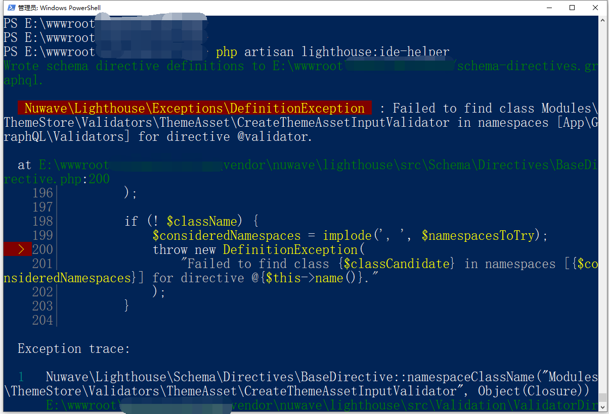 在 Lighthouse 5 中,报错:Failed to find class Modules\\ThemeStore\\Validators\\ThemeAsset\\CreateThemeAssetInputValidator in namespaces [App\\GraphQL\\Validators] for directive @validator.