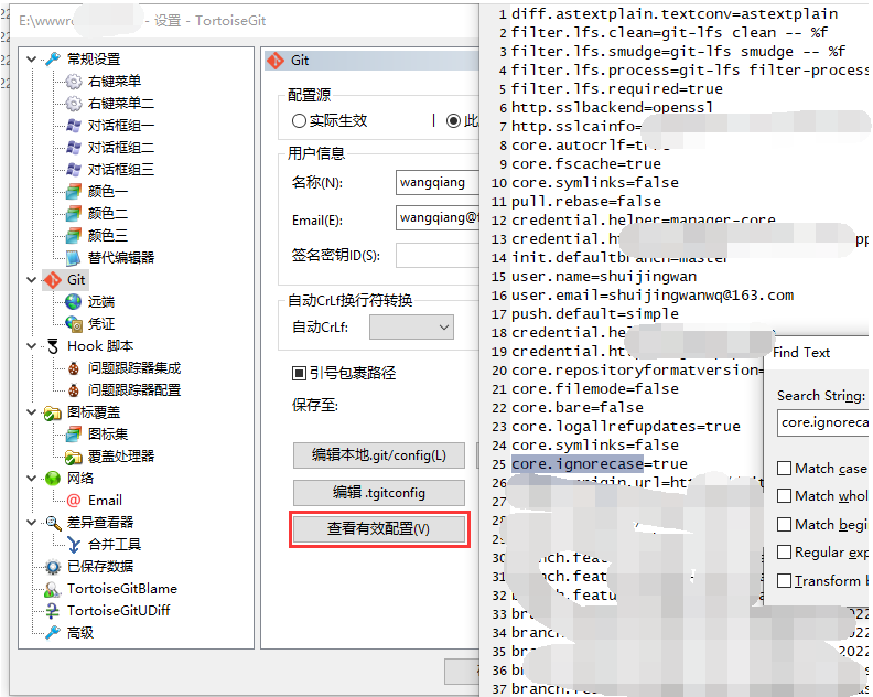 3、查看 TortoiseGit 的有效配置,ignorecase,忽略大小写为 true。如图3
