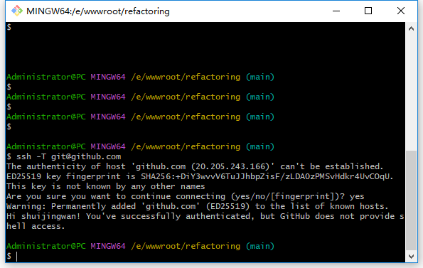 $ ssh -T git@github.com The authenticity of host 'github.com (20.205.243.166)' can't be established. ED25519 key fingerprint is SHA256:+DiY3wvvV6TuJJhbpZisF/zLDA0zPMSvHdkr4UvCOqU. This key is not known by any other names Are you sure you want to continue connecting (yes/no/[fingerprint])? yes Warning: Permanently added 'github.com' (ED25519) to the list of known hosts. Hi shuijingwan! You've successfully authenticated, but GitHub does not provide shell access.