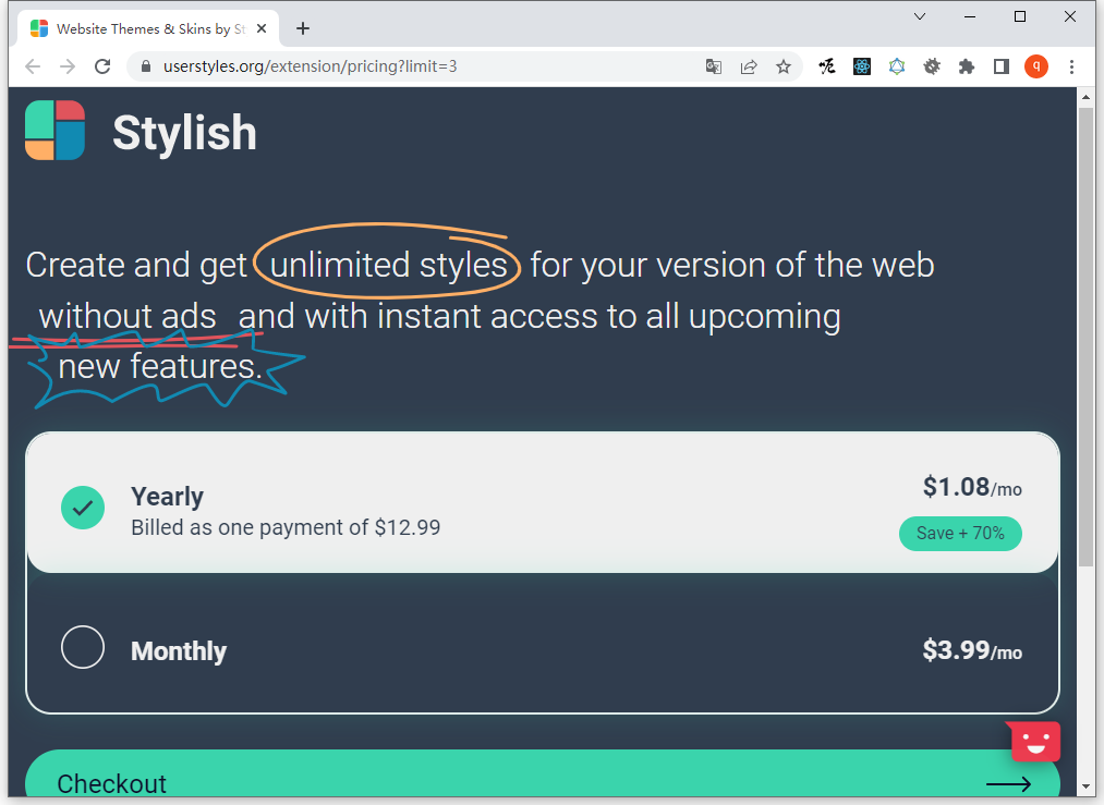 1、Stylish 需要收费,仅允许添加3个自定义样式。当添加第4个样式保存时,自动跳转至其官网,添加失败。如图1