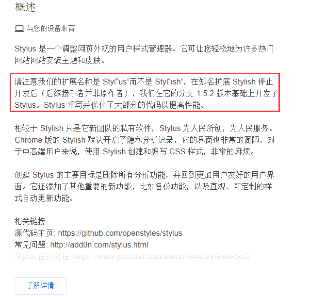 3、最终找到了替代扩展:Stylus。在知名扩展 Stylish 停止开发后(后续接手者并非原作者),在它的分支 1.5.2 版本基础上开发了 Stylus。如图2