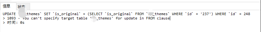 2、报错:1093 – You can’t specify target table ‘xx_themes’ for update in FROM clause。如图1