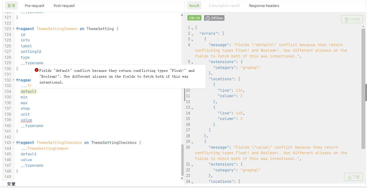 在 GraphQL API 响应报错:Fields “default” conflict because they return conflicting types Float! and Boolean!. Use different aliases on the fields to fetch both if this was intentional.