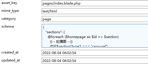 1、现有一段 PHP Blade 代码块,放在 MySQL 中,其代码存放在字段 schema 中,如图1