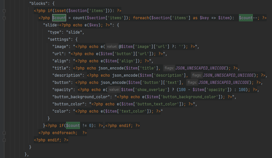 "button": <?php echo json_encode($item['button']['text'], JSON_UNESCAPED_UNICODE); ?>,