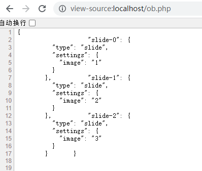 8、现在需要新建一个 PHP 脚本,然后使用输出缓冲来将 PHP 文件包含入一个字符串。参考:https://www.php.net/manual/zh/function.include.php ,新建 PHP 文件 ob.php,运行后,输出 json 结构,符合预期。如图5
