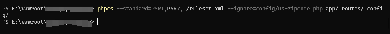 PS E:\wwwroot\object> phpcs --standard=PSR1,PSR2,./ruleset.xml --ignore=config/us-zipcode.php app/ routes/ config/