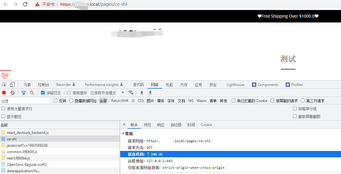 2、打开网址:https://object.local/pages/ce-shi ,响应 200。如图2