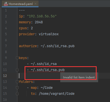 启动 vagrant 时,报错:psych.rb:456:in `parse’: (): found a tab character that violates indentation while scanning a plain scalar at line 10 column 7 (Psych::SyntaxError)