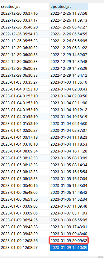 2、参考:https://www.shuijingwanwq.com/2022/07/11/6776/ ,发现仍然不符合预期。在第 7 步骤的调整后。同样的程序,在队列中运行后,字段 updated_at 的值,其对应的时区有时候仍然为:Asia/Shanghai,大部份时候的时区为:UTC。如图1