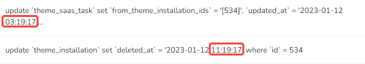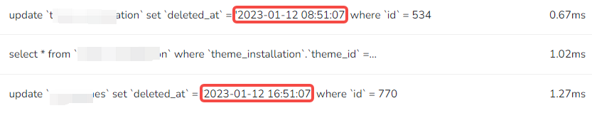 5、最终决定采用沿用原有步骤 4 的方案。不过步骤 4 的方案不适用于 delete() 方法,其生成的 SQL 中,deleted_at 的值的时区仍然为:Asia/Shanghai。如图3