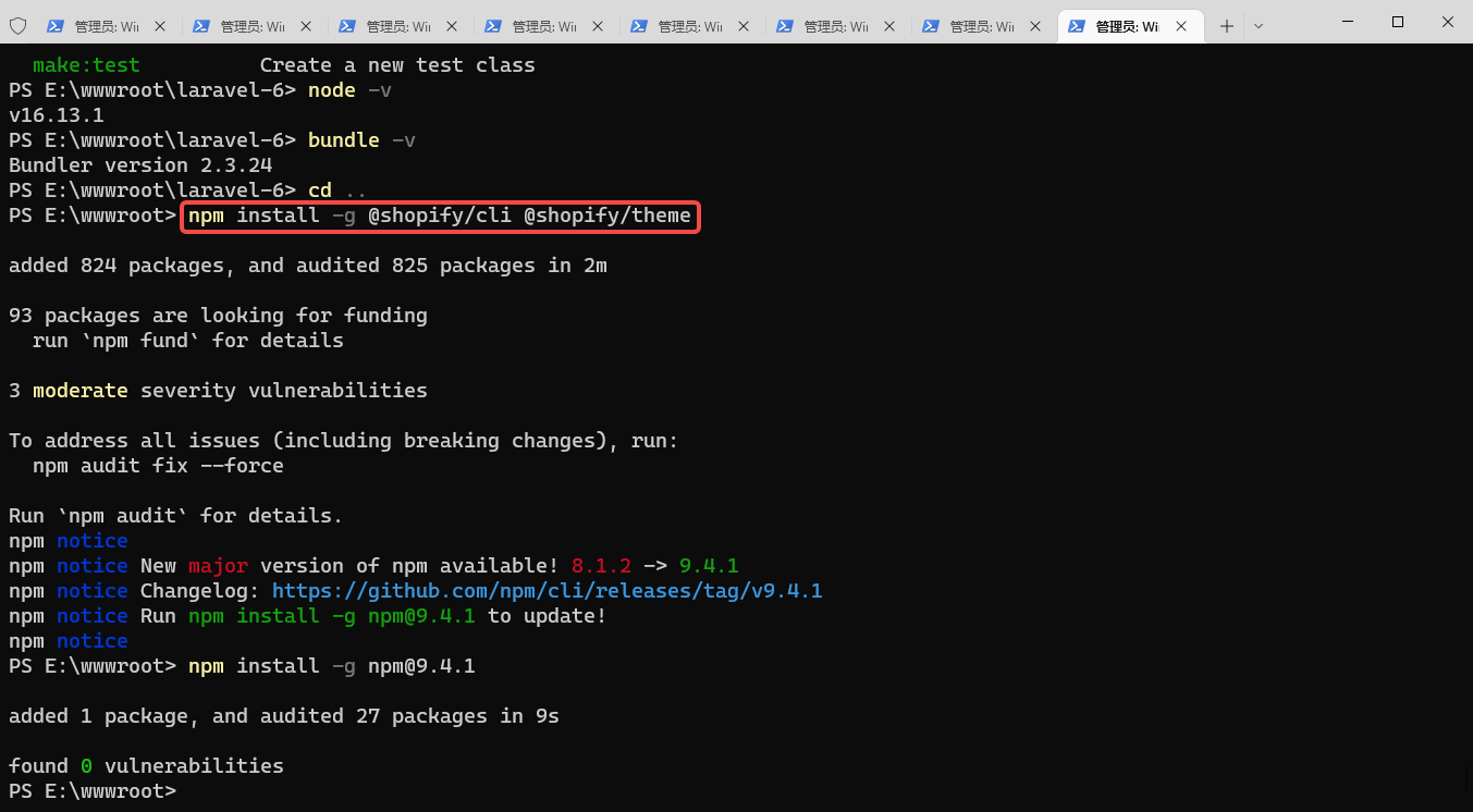 PS E:\wwwroot> npm install -g @shopify/cli @shopify/theme added 824 packages, and audited 825 packages in 2m 93 packages are looking for funding run `npm fund` for details 3 moderate severity vulnerabilities To address all issues (including breaking changes), run: npm audit fix --force Run `npm audit` for details. npm notice npm notice New major version of npm available! 8.1.2 -> 9.4.1 npm notice Changelog: https://github.com/npm/cli/releases/tag/v9.4.1 npm notice Run npm install -g npm@9.4.1 to update! npm notice