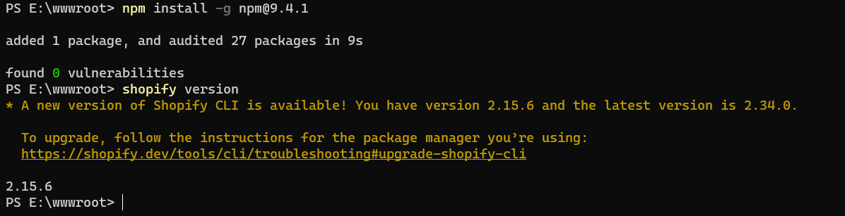 PS E:\wwwroot> shopify version * A new version of Shopify CLI is available! You have version 2.15.6 and the latest version is 2.34.0. To upgrade, follow the instructions for the package manager you’re using: https://shopify.dev/tools/cli/troubleshooting#upgrade-shopify-cli 2.15.6