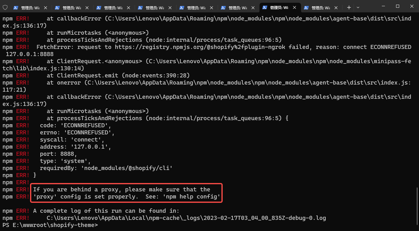 PS E:\wwwroot\shopify-theme> npm config rm proxy PS E:\wwwroot\shopify-theme> npm config rm https-proxy PS E:\wwwroot\shopify-theme> npm config get proxy null PS E:\wwwroot\shopify-theme>