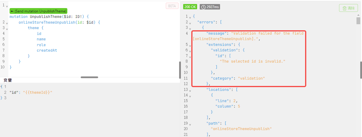 "message": "Validation failed for the field [onlineStoreThemeUnpublish].",