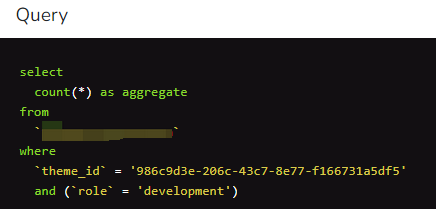 select count(*) as aggregate from `table` where `theme_id` = '986c9d3e-206c-43c7-8e77-f166731a5df5' and (`role` = 'development')