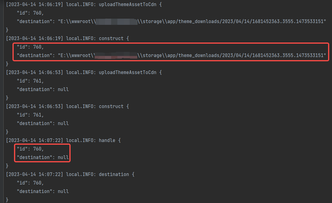 3、但是,参考:在 Laravel 6 中,在队列任务中,重试时的指数回退(exponential backoff)的实现。当想将静态变量传递给下一个队列任务时,仍然会导致相互覆盖的问题。在 handle 方法中,预期 760 的值不为 null ,但是现在已经被 761 的 null 给覆盖。如图3