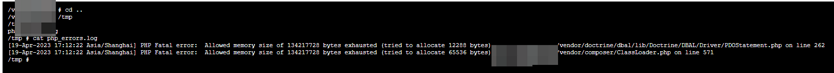 /var/www # cd /tmp /tmp # ls php_errors.log /tmp # cat php_errors.log [19-Apr-2023 17:12:22 Asia/Shanghai] PHP Fatal error: Allowed memory size of 134217728 bytes exhausted (tried to allocate 12288 bytes) in /var/www/object/vendor/doctrine/dbal/lib/Doctrine/DBAL/Driver/PDOStatement.php on line 262 [19-Apr-2023 17:12:22 Asia/Shanghai] PHP Fatal error: Allowed memory size of 134217728 bytes exhausted (tried to allocate 65536 bytes) in /var/www/object/vendor/composer/ClassLoader.php on line 571