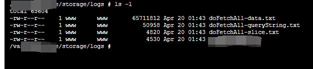 /var/www/object/storage/logs # ls -l total 65604 -rw-r--r-- 1 www www 65711812 Apr 20 01:43 doFetchAll-data.txt -rw-r--r-- 1 www www 50958 Apr 20 01:43 doFetchAll-queryString.txt -rw-r--r-- 1 www www 4820 Apr 20 01:43 doFetchAll-slice.txt -rw-r--r-- 1 www www 4530 Apr 20 01:43 explicabo78.log /var/www/object/storage/logs #