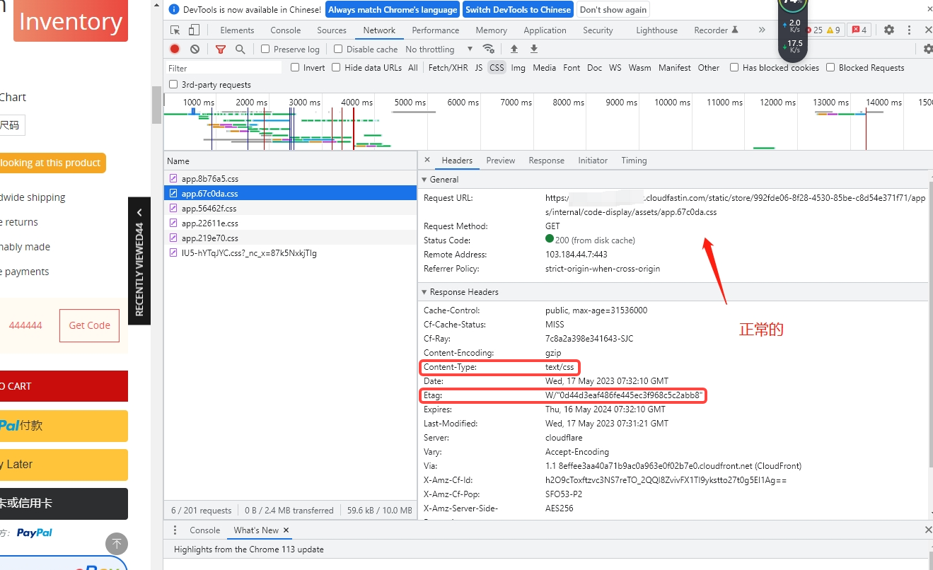 1、同样的 CSS 文件(其 Etag 相等),其响应的 Content-Type 等于 text/css 时,网页界面正常。如图1