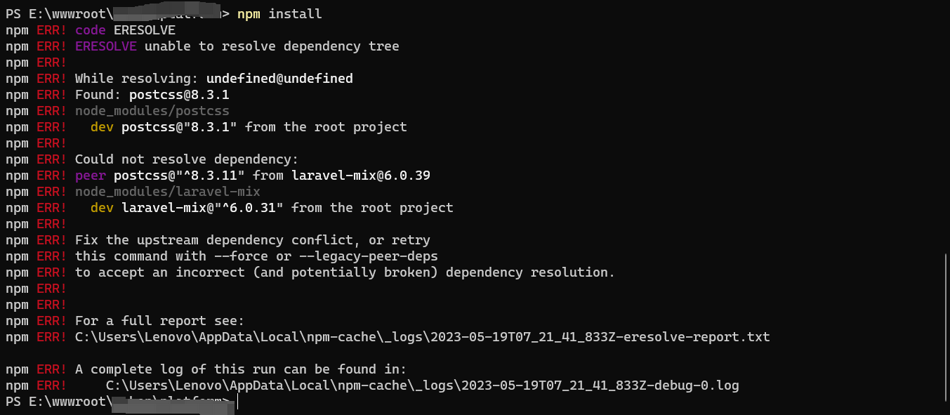 PS E:\wwwroot\object> npm install npm ERR! code ERESOLVE npm ERR! ERESOLVE unable to resolve dependency tree npm ERR! npm ERR! While resolving: undefined@undefined npm ERR! Found: postcss@8.3.1 npm ERR! node_modules/postcss npm ERR! dev postcss@"8.3.1" from the root project npm ERR! npm ERR! Could not resolve dependency: npm ERR! peer postcss@"^8.3.11" from laravel-mix@6.0.39 npm ERR! node_modules/laravel-mix npm ERR! dev laravel-mix@"^6.0.31" from the root project npm ERR! npm ERR! Fix the upstream dependency conflict, or retry npm ERR! this command with --force or --legacy-peer-deps npm ERR! to accept an incorrect (and potentially broken) dependency resolution. npm ERR! npm ERR! npm ERR! For a full report see: npm ERR! C:\Users\Lenovo\AppData\Local\npm-cache\_logs\2023-05-19T07_21_41_833Z-eresolve-report.txt npm ERR! A complete log of this run can be found in: npm ERR! C:\Users\Lenovo\AppData\Local\npm-cache\_logs\2023-05-19T07_21_41_833Z-debug-0.log