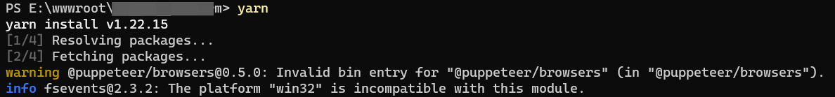 PS E:\wwwroot\object> yarn yarn install v1.22.15 [1/4] Resolving packages... [2/4] Fetching packages...