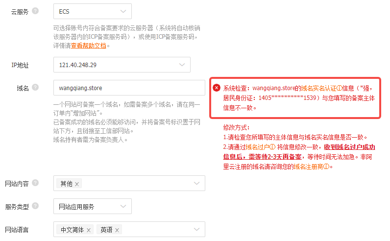 系统检查:wangqiang.store的域名实名认证ⓘ信息(*强,居民身份证:1405**********1539)与您填写的备案主体信息不一致