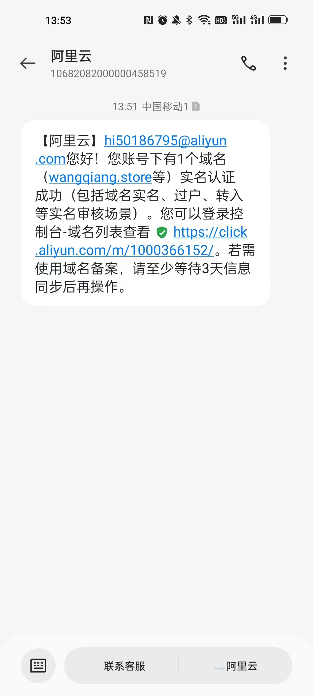 2、可能是因为域名是刚才注册的。收到短信内容如下:【阿里云】hi50186795@aliyun.com您好!您账号下有1个域名(wangqiang.store等)实名认证成功(包括域名实名、过户、转入等实名审核场景)。您可以登录控制台-域名列表查看 https://click.aliyun.com/m/1000366152/。若需使用域名备案,请至少等待3天信息同步后再操作。 如图2