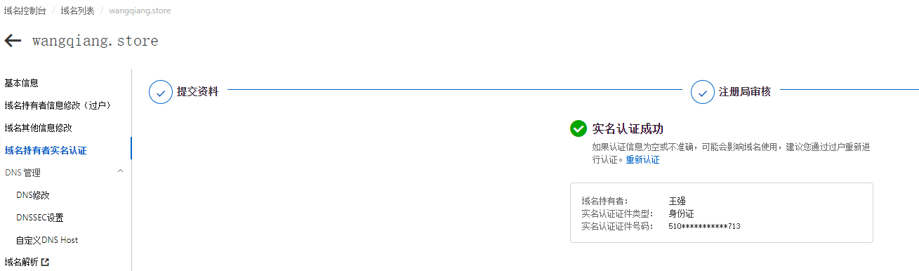 3、在域名控制台 – 域名列表 – 域名持有者实名认证 页面,可以确认域名实名认证ⓘ信息是正确的,且并非提示中的身份证:1405**********1539 。如图3