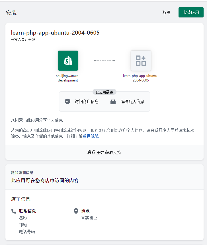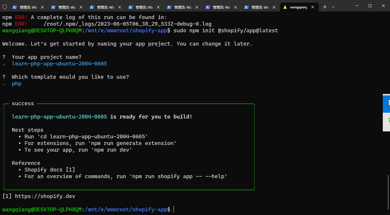 wangqiang@DESKTOP-QLPK8QM:/mnt/e/wwwroot/shopify-app$ sudo npm init @shopify/app@latest Welcome. Let’s get started by naming your app project. You can change it later. ? Your app project name? ✔ learn-php-app-ubuntu-2004-0602 ? Which template would you like to use? ✔ php