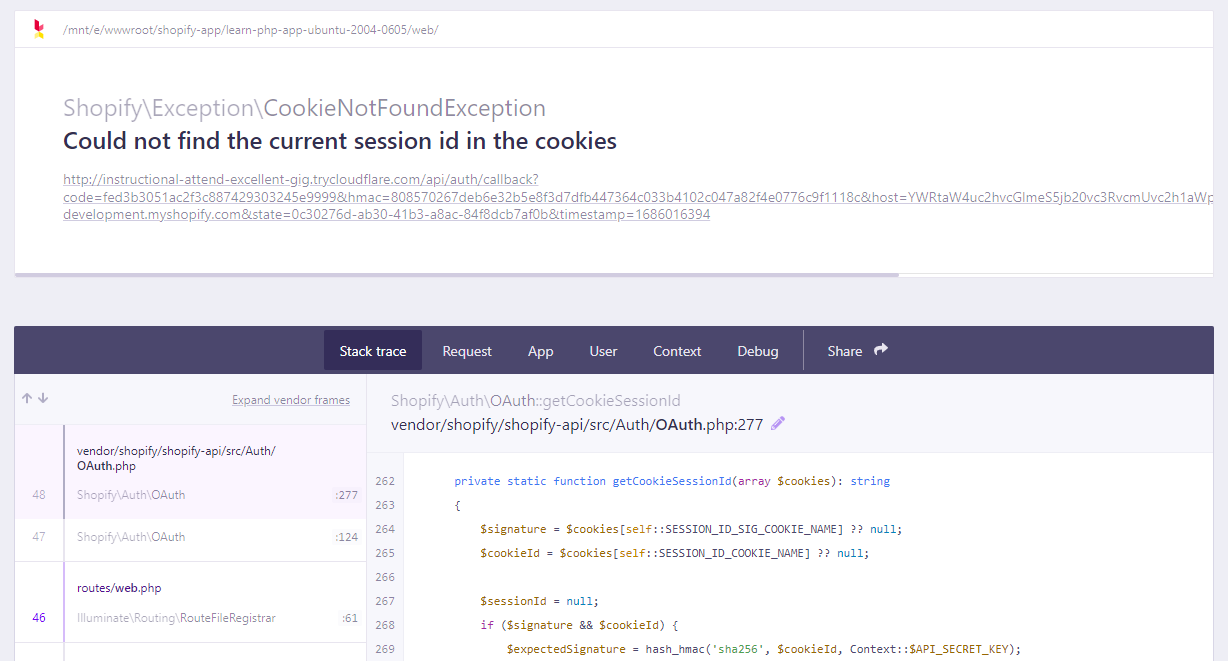 18、安装应用时报错:Shopify\Exception\CookieNotFoundException Could not find the current session id in the cookies。如图3