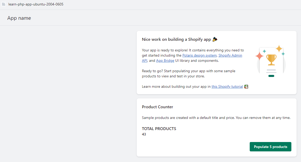 wangqiang@DESKTOP-QLPK8QM:/mnt/e/wwwroot/shopify-app$ sudo npm init @shopify/app@latest Welcome. Let’s get started by naming your app project. You can change it later. ? Your app project name? ✔ learn-php-app-ubuntu-2004-0605 ? Which template would you like to use? ✔ php ╭─ success ────────────────────────────────────────────────────────────────────╮ │ │ │ learn-php-app-ubuntu-2004-0605 is ready for you to build! │ │ │ │ Next steps │ │ • Run `cd learn-php-app-ubuntu-2004-0605` │ │ • For extensions, run `npm run generate extension` │ │ • To see your app, run `npm run dev` │ │ │ │ Reference │ │ • Shopify docs [1] │ │ • For an overview of commands, run `npm run shopify app -- --help` │ │ │ ╰──────────────────────────────────────────────────────────────────────────────╯ [1] https://shopify.dev