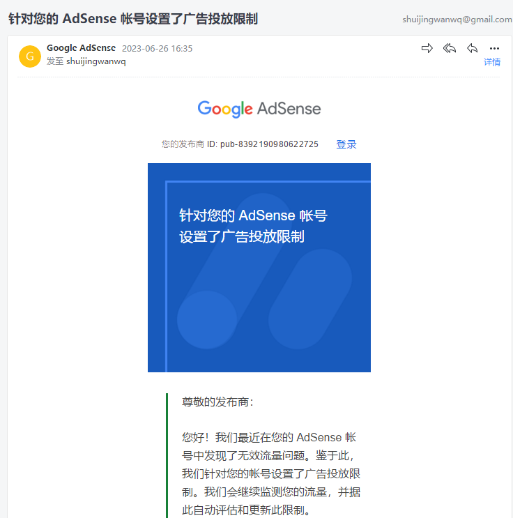 1、收到了邮件:针对您的 AdSense 帐号设置了广告投放限制。尊敬的发布商:您好!我们最近在您的 AdSense 帐号中发现了无效流量问题。鉴于此,我们针对您的帐号设置了广告投放限制。我们会继续监测您的流量,并据此自动评估和更新此限制。如图1