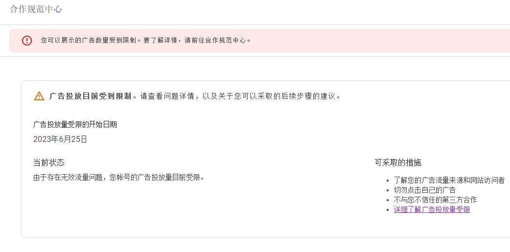 2、在 Google AdSense 的 合作规范中心 查看详情。广告投放量受限的开始日期 2023年6月25日 当前状态 由于存在无效流量问题,您帐号的广告投放量目前受限。如图2
