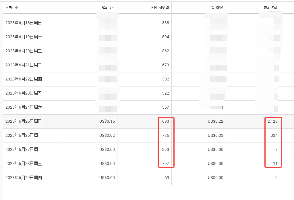 3、在 Google AdSense 的报告中,从 2023年6月25日 开始,网页浏览量保持不变,但是广告展示次数是断崖式的下跌。如图3