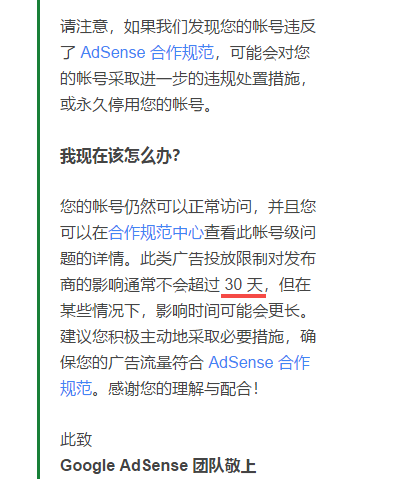 4、暂时并没有适当的解决方案,因为我并没有蓄意制造无效流量。邮件中提示:此类广告投放限制对发布商的影响通常不会超过 30 天,但在某些情况下,影响时间可能会更长。决定等待 30 天再继续观察广告展示情况。如图4