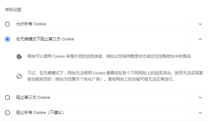 4、允许或阻止 Cookie,默认是选择 在无痕模式下阻止第三方 Cookie。如图3