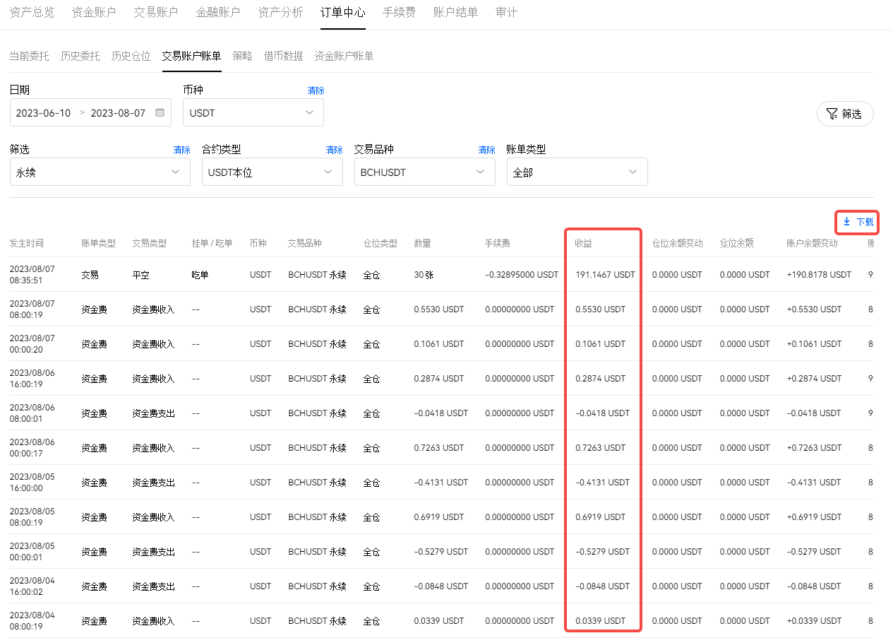 4、由于 WEB 页面中没有收益一列的统计,点击 下载 链接,日期:2023-05-01 > 2023-08-16,如图3